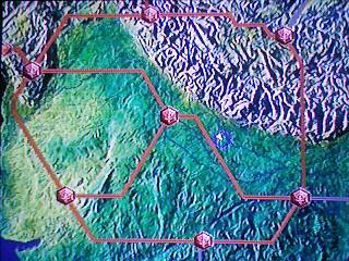 ほぼ陸地エリアです。上側に山岳地帯があり、特にチュウゴク側は山岳と雪原に進路を阻まれています。宇宙からも攻めることができます。海からの進入はできません。敵の戦力が整っていることが多いです。